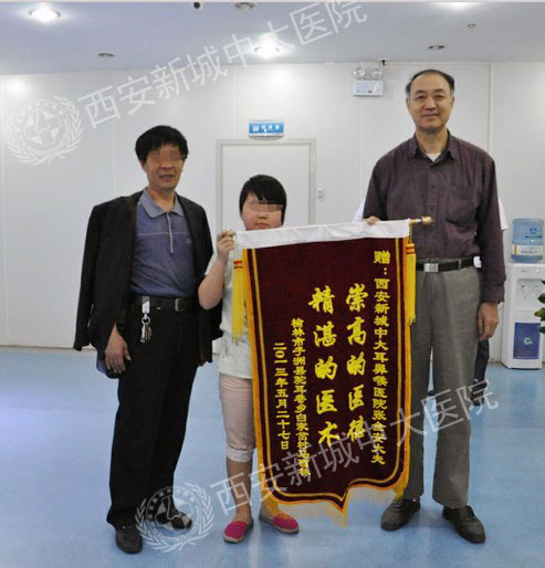 经张教授亲自主刀手术(“全安”疗法以及胆脂瘤切除术)后,听力下降的症状也随之消失。手术后,据出院病历显示,马艳无右耳闷胀堵塞感,无听力下降、耳闷,无耳流脓,无耳痛,头晕、头痛等不适。家里人看到马艳的病情很快就痊愈,特别感激,5月27日,为了感激张教授,马艳随同父亲不远千里,特意从榆林老家赶来西安新城中大耳鼻喉医院,与父亲一起亲自将锦旗送到张全安教授手中,称赞张教授“精湛的医术,崇高的医德。