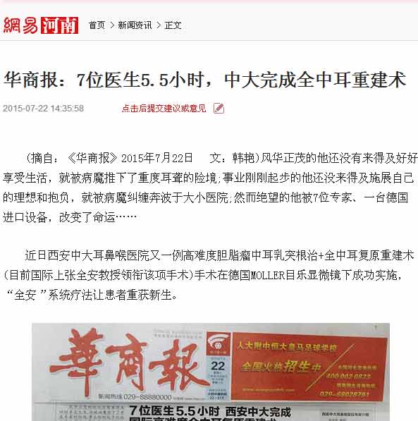 (摘自:《华商报》2015年7月22日 文:韩艳)风华正茂的他还没有来得及好好享受生活,就被病魔推下了重度耳聋的险境;事业刚刚起步的他还没来得及施展自己的理想和抱负,就被病魔纠缠奔波于大小医院;然而绝望的他被7位医生、一台进口设备,改变了命运……